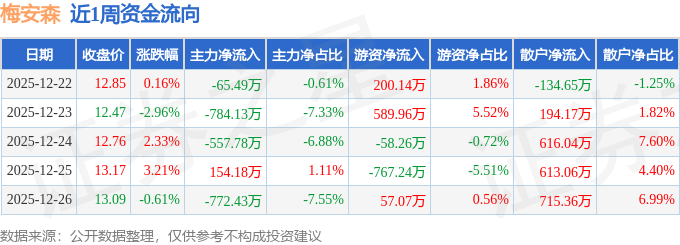 资金流向数据方面,本周梅安森主力资金合计净流出2025.65万元,游资资金合计净流入21.67万元,散户资金合计净流入2003.98万元。本周资金流向一览见下表: