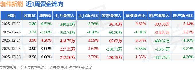 资金流向数据方面,本周珈伟新能主力资金合计净流入260.66万元,游资资金合计净流出48.22万元,散户资金合计净流出212.44万元。本周资金流向一览见下表: