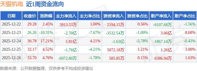 资金流向数据方面,本周天银机电主力资金合计净流出2.96亿元,游资资金合计净流出1.19亿元,散户资金合计净流入4.16亿元。本周资金流向一览见下表: