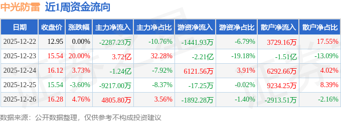 资金流向数据方面,本周中光防雷主力资金合计净流入1.81亿元,游资资金合计净流出1.93亿元,散户资金合计净流入1244.74万元。本周资金流向一览见下表: