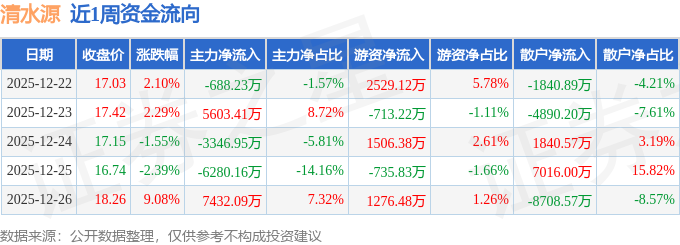 资金流向数据方面,本周清水源主力资金合计净流入2720.16万元,游资资金合计净流入3862.93万元,散户资金合计净流出6583.09万元。本周资金流向一览见下表:
