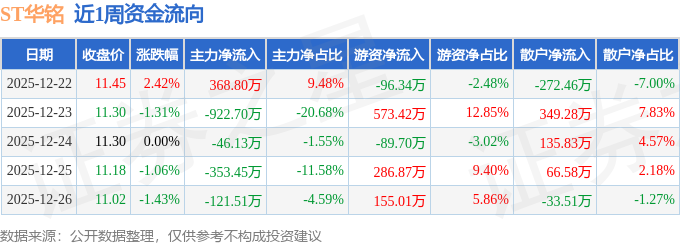 证券之星消息,截至2025年12月26日收盘,ST华铭(300462)报收于11.02元,较上周的11.18元下跌1.43%。本周,ST华铭12月23日盘中最高价报11.5元。12月26日盘中最低价报11.0元。ST华铭当前最新总市值19.97亿元,在计算机设备板块市值排名83/84,在两市A股市值排名5069/5178。