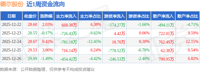 资金流向数据方面,本周德尔股份主力资金合计净流出577.51万元,游资资金合计净流出1176.21万元,散户资金合计净流入1753.72万元。本周资金流向一览见下表: