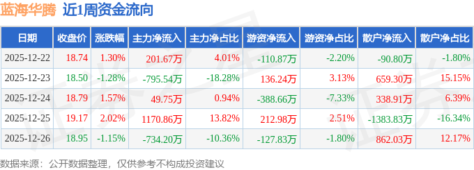 资金流向数据方面,本周蓝海华腾主力资金合计净流出107.46万元,游资资金合计净流出278.15万元,散户资金合计净流入385.61万元。本周资金流向一览见下表: