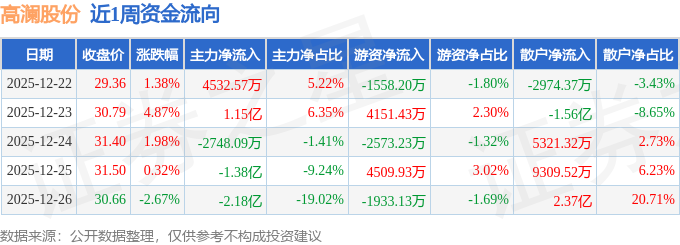资金流向数据方面,本周高澜股份主力资金合计净流出2.23亿元,游资资金合计净流入2596.8万元,散户资金合计净流入1.97亿元。本周资金流向一览见下表: