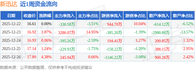 资金流向数据方面,本周新迅达主力资金合计净流入2576.25万元,游资资金合计净流出470.53万元,散户资金合计净流出2105.72万元。本周资金流向一览见下表: