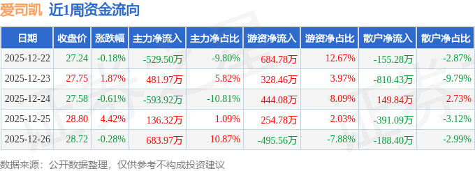 资金流向数据方面,本周爱司凯主力资金合计净流入178.84万元,游资资金合计净流入1216.53万元,散户资金合计净流出1395.37万元。本周资金流向一览见下表: