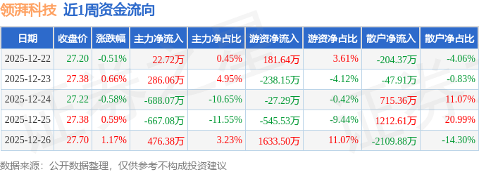资金流向数据方面,本周领湃科技主力资金合计净流出569.98万元,游资资金合计净流入1004.17万元,散户资金合计净流出434.2万元。本周资金流向一览见下表: