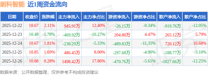 资金流向数据方面,本周朗科智能主力资金合计净流入2230.57万元,游资资金合计净流出1079.62万元,散户资金合计净流出1150.95万元。本周资金流向一览见下表: