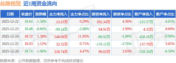 资金流向数据方面,本周丝路视觉主力资金合计净流入713.13万元,游资资金合计净流入136.87万元,散户资金合计净流出849.99万元。本周资金流向一览见下表: