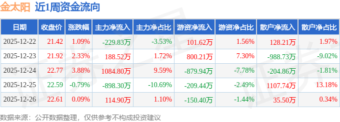 资金流向数据方面,本周金太阳主力资金合计净流入260.09万元,游资资金合计净流出337.95万元,散户资金合计净流入77.86万元。本周资金流向一览见下表: