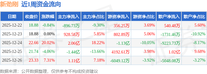 资金流向数据方面,本周新劲刚主力资金合计净流入1.73亿元,游资资金合计净流出1.2亿元,散户资金合计净流出5276.8万元。本周资金流向一览见下表: