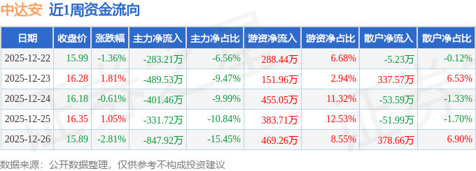 资金流向数据方面,本周中达安主力资金合计净流出2353.85万元,游资资金合计净流入1748.43万元,散户资金合计净流入605.42万元。本周资金流向一览见下表:
