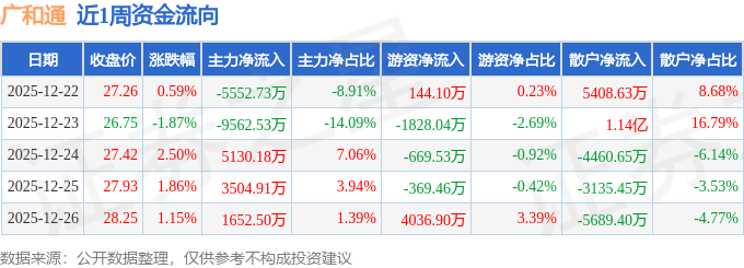 资金流向数据方面,本周广和通主力资金合计净流出4827.66万元,游资资金合计净流入1313.97万元,散户资金合计净流入3513.69万元。本周资金流向一览见下表: