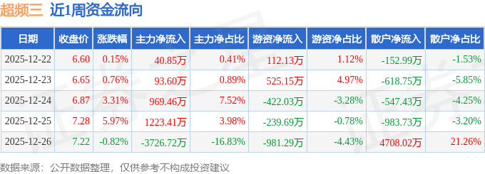 证券之星消息,截至2025年12月26日收盘,超频三(300647)报收于7.22元,较上周的6.59元上涨9.56%。本周,超频三12月25日盘中最高价报7.43元。12月23日盘中最低价报6.5元。超频三当前最新总市值33.02亿元,在消费电子板块市值排名85/90,在两市A股市值排名4358/5178。
