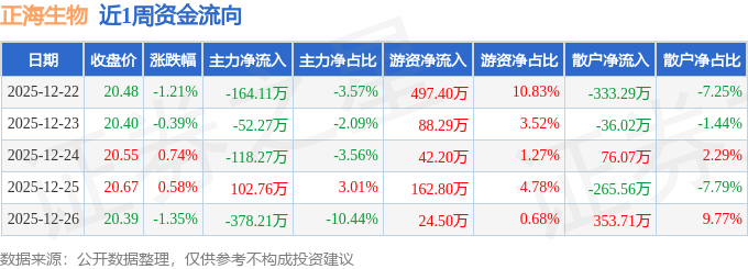 资金流向数据方面,本周正海生物主力资金合计净流出610.11万元,游资资金合计净流入815.19万元,散户资金合计净流出205.09万元。本周资金流向一览见下表: