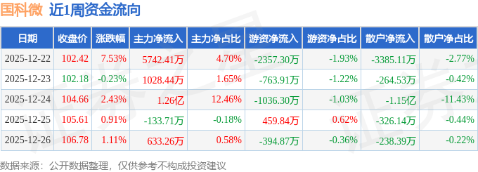 资金流向数据方面,本周国科微主力资金合计净流入1.98亿元,游资资金合计净流出4092.54万元,散户资金合计净流出1.58亿元。本周资金流向一览见下表: