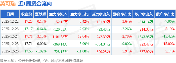 资金流向数据方面,本周英可瑞主力资金合计净流入35.58万元,游资资金合计净流入146.83万元,散户资金合计净流出182.41万元。本周资金流向一览见下表: