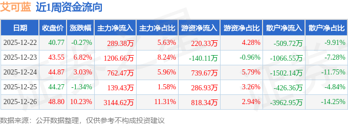 资金流向数据方面,本周艾可蓝主力资金合计净流入5542.55万元,游资资金合计净流入1925.16万元,散户资金合计净流出7467.71万元。本周资金流向一览见下表: