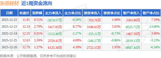 资金流向数据方面,本周东岳硅材主力资金合计净流入1.03亿元,游资资金合计净流入5246.18万元,散户资金合计净流出1.56亿元。本周资金流向一览见下表: