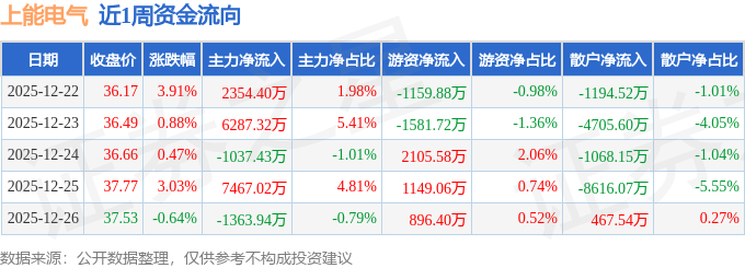 资金流向数据方面,本周上能电气主力资金合计净流入1.37亿元,游资资金合计净流入1409.44万元,散户资金合计净流出1.51亿元。本周资金流向一览见下表: