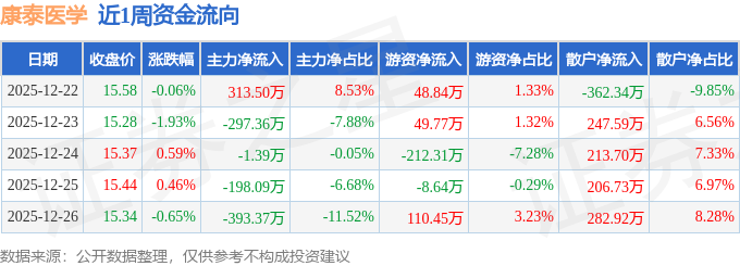 资金流向数据方面,本周康泰医学主力资金合计净流出576.72万元,游资资金合计净流出11.89万元,散户资金合计净流入588.61万元。本周资金流向一览见下表: