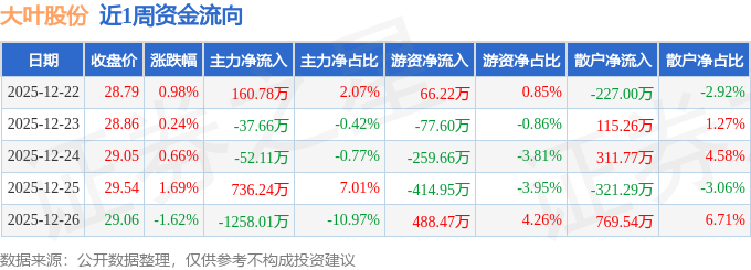 资金流向数据方面,本周大叶股份主力资金合计净流出450.76万元,游资资金合计净流出197.52万元,散户资金合计净流入648.28万元。本周资金流向一览见下表: