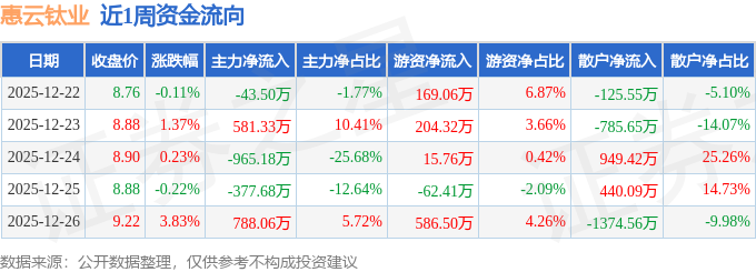 资金流向数据方面,本周惠云钛业主力资金合计净流出16.96万元,游资资金合计净流入913.22万元,散户资金合计净流出896.26万元。本周资金流向一览见下表:
