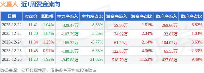 资金流向数据方面,本周火星人主力资金合计净流出1736.82万元,游资资金合计净流入837.63万元,散户资金合计净流入899.19万元。本周资金流向一览见下表: