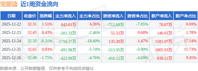 资金流向数据方面,本周宝丽迪主力资金合计净流出2189.16万元,游资资金合计净流出1452.13万元,散户资金合计净流入3641.29万元。本周资金流向一览见下表: