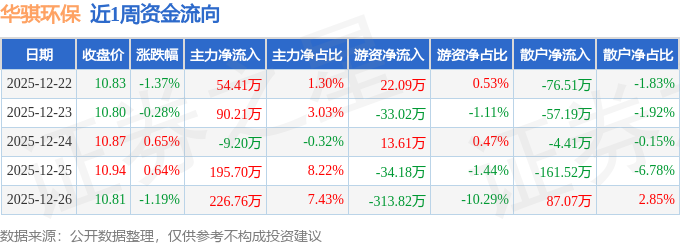 证券之星消息,截至2025年12月26日收盘,华骐环保(300929)报收于10.81元,较上周的10.98元下跌1.55%。本周,华骐环保12月22日盘中最高价报11.08元。12月23日盘中最低价报10.66元。华骐环保当前最新总市值14.28亿元,在环境治理板块市值排名104/106,在两市A股市值排名5163/5178。