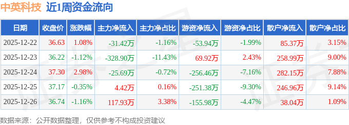 资金流向数据方面,本周中英科技主力资金合计净流出263.66万元,游资资金合计净流出647.85万元,散户资金合计净流入911.51万元。本周资金流向一览见下表: