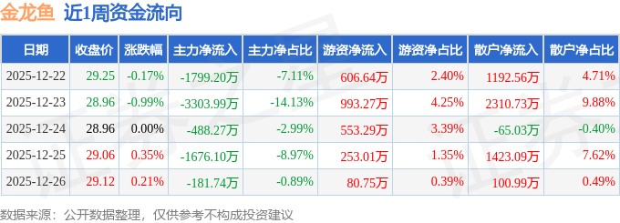 资金流向数据方面,本周金龙鱼主力资金合计净流出7449.3万元,游资资金合计净流入2486.96万元,散户资金合计净流入4962.33万元。本周资金流向一览见下表: