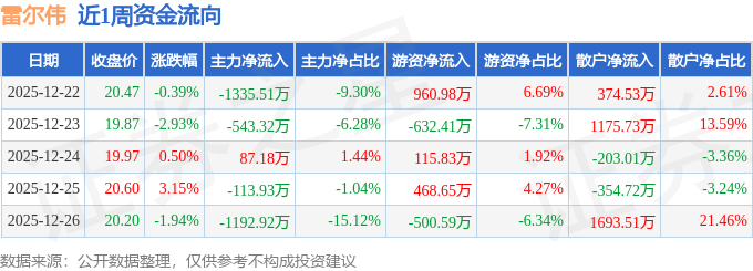 资金流向数据方面,本周雷尔伟主力资金合计净流出3098.51万元,游资资金合计净流入412.47万元,散户资金合计净流入2686.04万元。本周资金流向一览见下表: