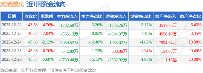 资金流向数据方面,本周英诺激光主力资金合计净流出1.77亿元,游资资金合计净流出1.05亿元,散户资金合计净流入2.82亿元。本周资金流向一览见下表: