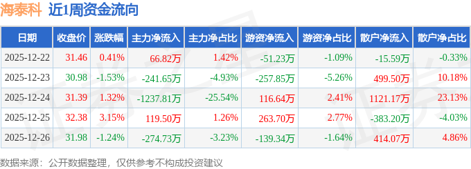 资金流向数据方面,本周海泰科主力资金合计净流出1567.87万元,游资资金合计净流出68.08万元,散户资金合计净流入1635.95万元。本周资金流向一览见下表: