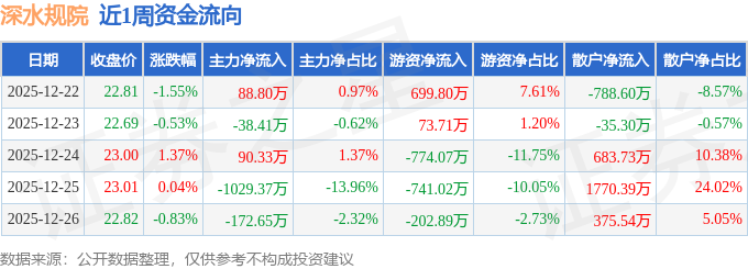 资金流向数据方面,本周深水规院主力资金合计净流出1061.3万元,游资资金合计净流出944.46万元,散户资金合计净流入2005.76万元。本周资金流向一览见下表:
