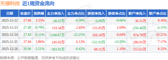 资金流向数据方面,本周天禄科技主力资金合计净流出1450.65万元,游资资金合计净流出12.56万元,散户资金合计净流入1463.21万元。本周资金流向一览见下表: