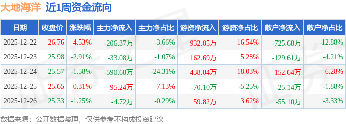 资金流向数据方面,本周大地海洋主力资金合计净流出739.6万元,游资资金合计净流入1522.49万元,散户资金合计净流出782.89万元。本周资金流向一览见下表: