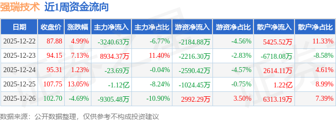 资金流向数据方面,本周强瑞技术主力资金合计净流出1.48亿元,游资资金合计净流出5023.76万元,散户资金合计净流入1.99亿元。本周资金流向一览见下表: