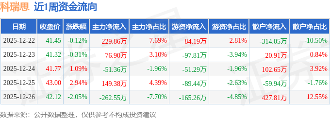 资金流向数据方面,本周科瑞思主力资金合计净流入142.24万元,游资资金合计净流出319.61万元,散户资金合计净流入177.38万元。本周资金流向一览见下表: