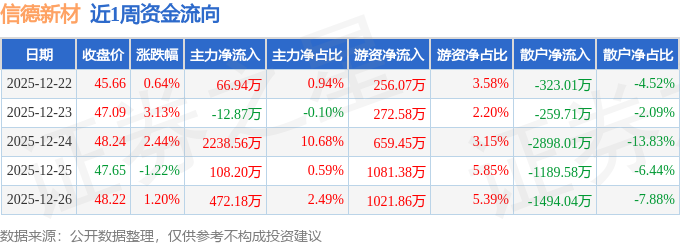 资金流向数据方面,本周信德新材主力资金合计净流入2873.0万元,游资资金合计净流入3291.34万元,散户资金合计净流出6164.34万元。本周资金流向一览见下表:
