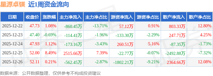 资金流向数据方面,本周星源卓镁主力资金合计净流入805.19万元,游资资金合计净流出1640.66万元,散户资金合计净流入835.47万元。本周资金流向一览见下表:
