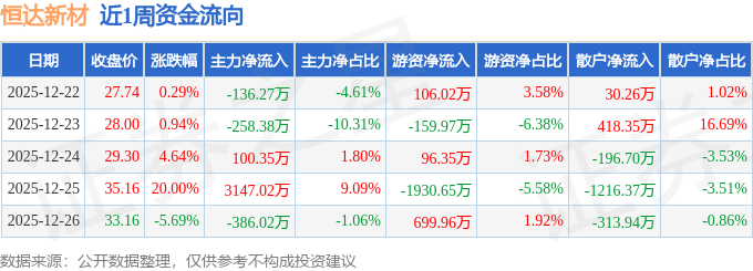 资金流向数据方面,本周恒达新材主力资金合计净流入2466.7万元,游资资金合计净流出1188.29万元,散户资金合计净流出1278.41万元。本周资金流向一览见下表: