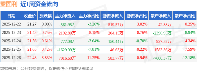 资金流向数据方面,本周盟固利主力资金合计净流入6240.39万元,游资资金合计净流入1203.67万元,散户资金合计净流出7444.06万元。本周资金流向一览见下表:
