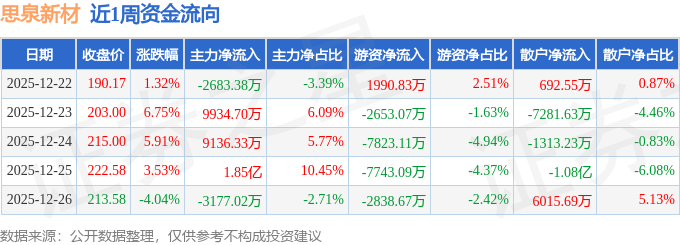 资金流向数据方面,本周思泉新材主力资金合计净流入3.17亿元,游资资金合计净流出1.91亿元,散户资金合计净流出1.27亿元。本周资金流向一览见下表: