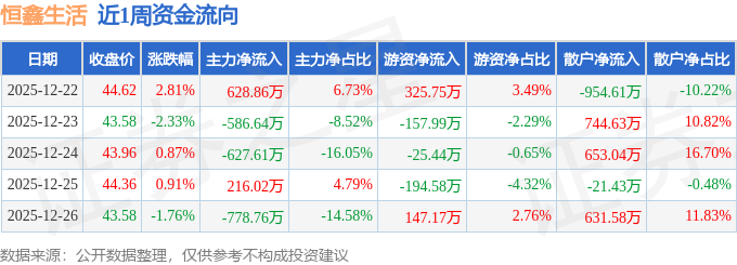 资金流向数据方面,本周恒鑫生活主力资金合计净流出1148.13万元,游资资金合计净流入94.92万元,散户资金合计净流入1053.21万元。本周资金流向一览见下表: