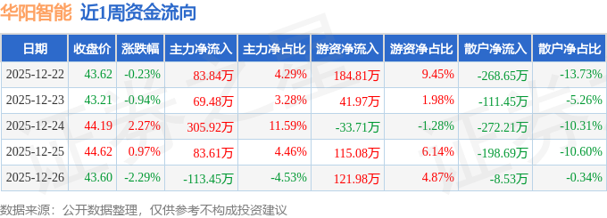 证券之星消息,截至2025年12月26日收盘,华阳智能(301502)报收于43.6元,较上周的43.72元下跌0.27%。本周,华阳智能12月26日盘中最高价报44.78元。12月23日盘中最低价报42.92元。华阳智能当前最新总市值24.89亿元,在电机板块市值排名25/25,在两市A股市值排名4874/5178。