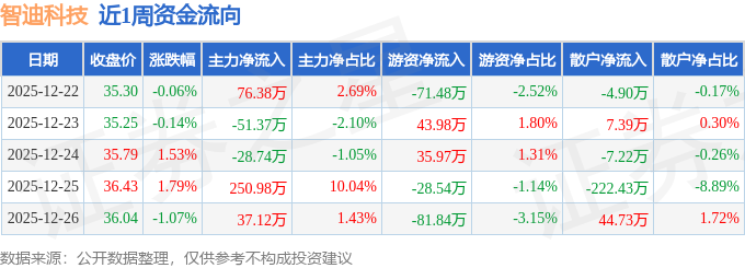 资金流向数据方面,本周智迪科技主力资金合计净流入284.37万元,游资资金合计净流出101.92万元,散户资金合计净流出182.44万元。本周资金流向一览见下表: