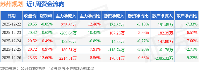资金流向数据方面,本周苏州规划主力资金合计净流入2298.28万元,游资资金合计净流入10.08万元,散户资金合计净流出2308.36万元。本周资金流向一览见下表: